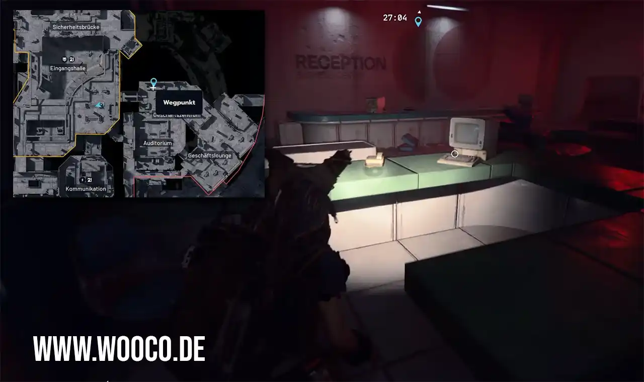 Im nördlichsten Teil des Bereichs findest du die Rezeption. Dort steht ein Computerterminal, an dem du die Gästeliste der Forscherin herunterladen kannst. Sobald du nah genug bist, erscheint das gelbe Interaktionssymbol.