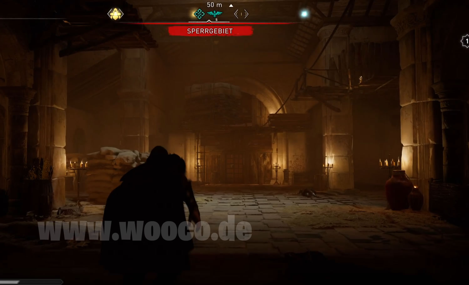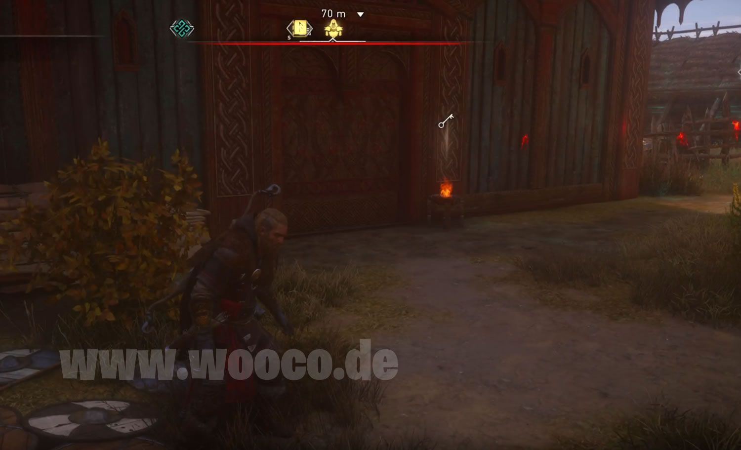 In Tempelburh, weit im Norden von Ledecestrescire. Im Nördlichen Teil von Tempelburh gibt es Außerhalb einen Wachturm. Ihr müsst in den oberen Teil des Turms klettern, zwei Wchen beseitigen und Odins Sicht Anwenden. Ihr seht dann zwei Seile die ihr abschießen müsst, dadurch kracht die Fracht nach unten.