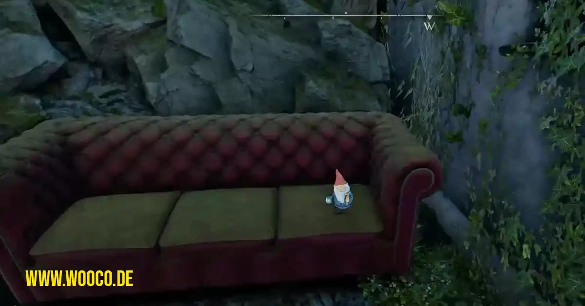 Zwerg #1: Der erste Gnom versteckt sich direkt nach dem Dorfeingang von Casterfell Woods. Folge der Straße in Richtung Mereview Hotel. Auf der linken Seite des Gebäudes findest Du eine schattige Sitzecke – dort sitzt der Gnom ganz entspannt auf einer alten Couch. Zeit für den ersten Schlag.