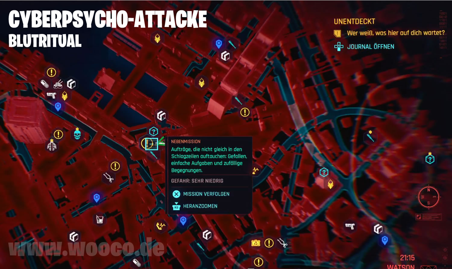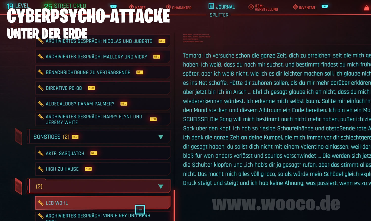 Insgesamt gibt es 17 Cyberpsycho-Attacken im Spiel zu finden. Diese Nebenmissionen können beim ersten Anlauf etwas Verwirrend sein. Wenn ihr den eigentlichen Boss erledigt habt, müsst ihr den jeweiligen Splitter lesen und eine Nachricht an Regina Jones senden.