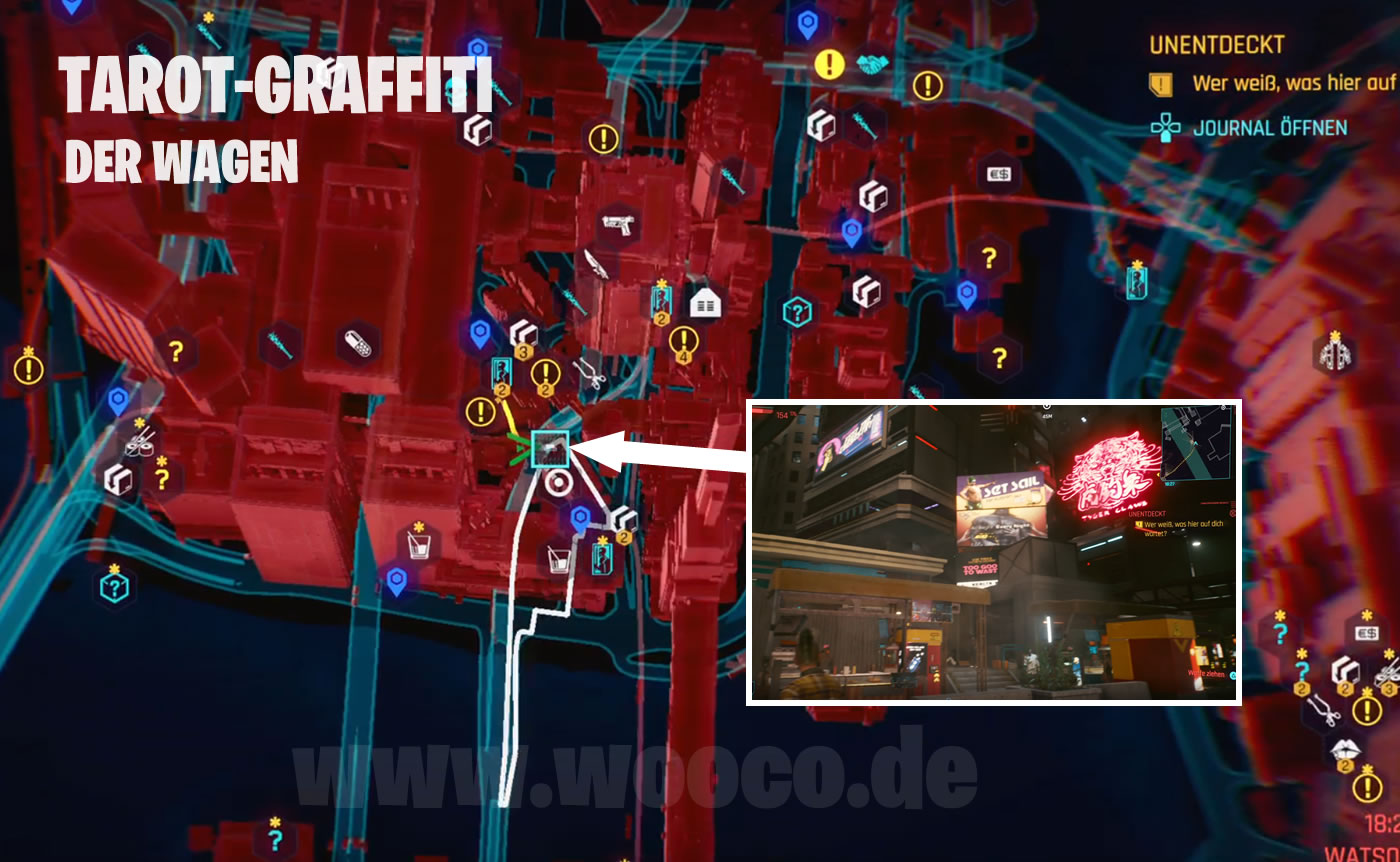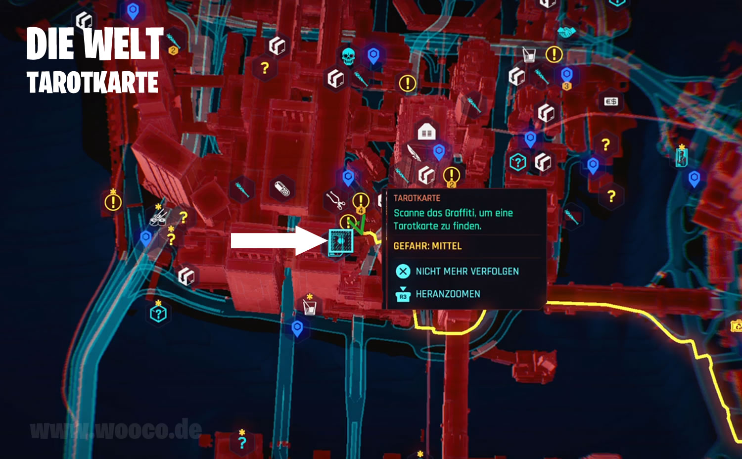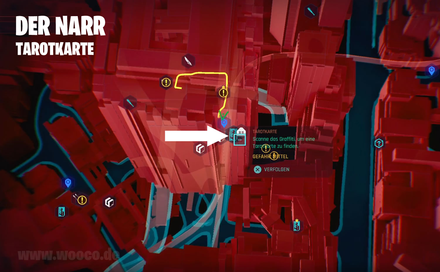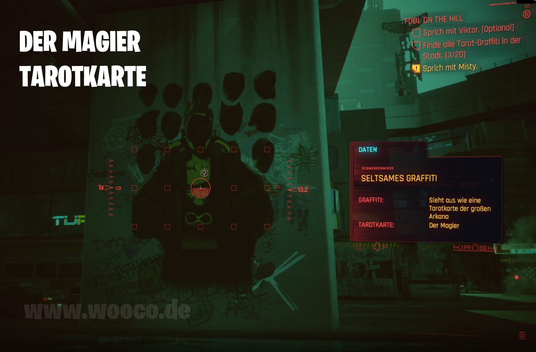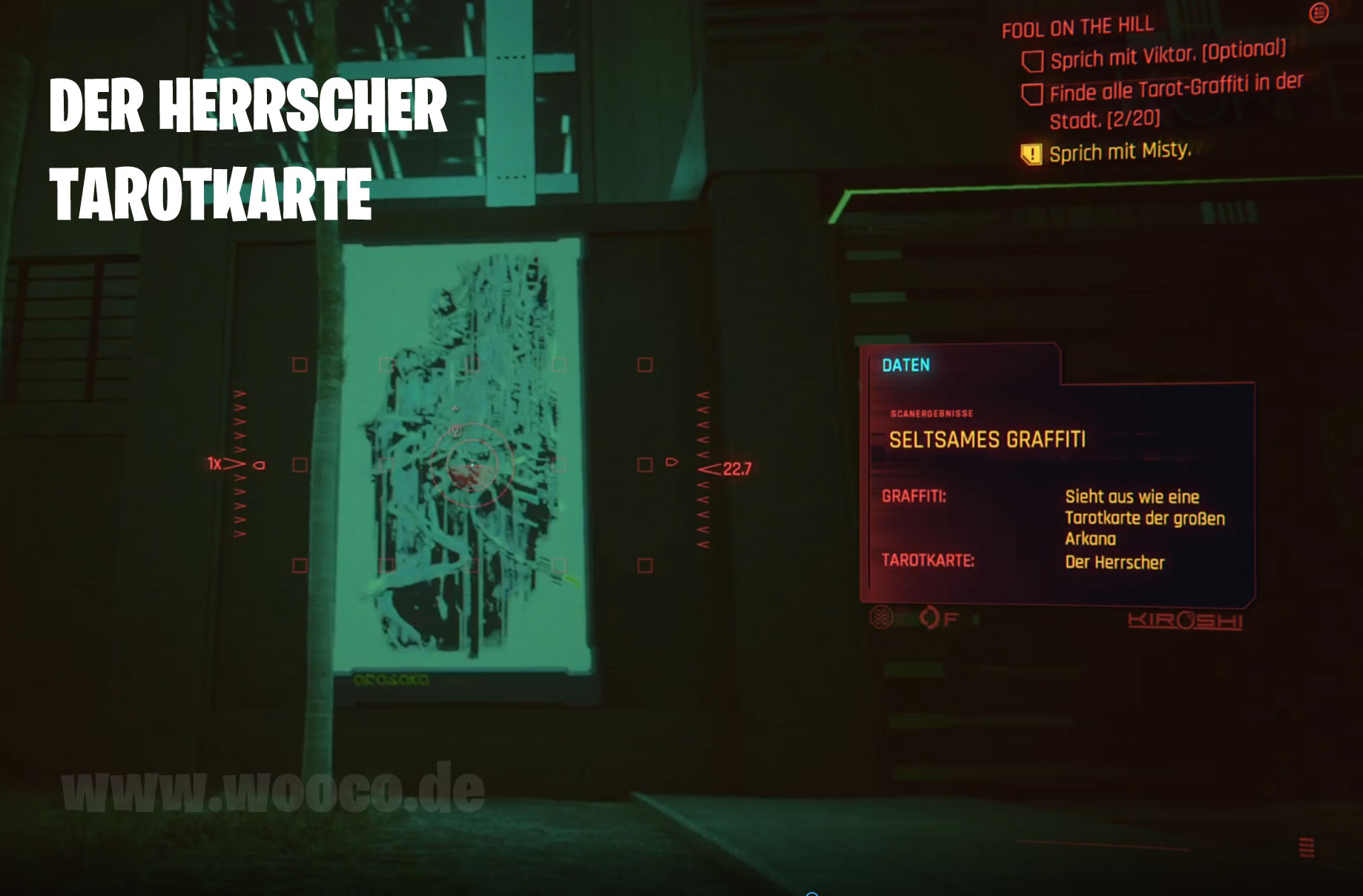 Die Mission „Der wandernde Narr“ wird freigeschaltet sobald ihr die erste Tarotkarte gefunden habt. Tarotkarten zählen auch als eine Art Sammlerstück in Cyberpunk 2077. Die Tarotkarten werden im Verlauf der Geschichte automatisch auf eurer Karte markiert. Wenn ihr an einem Graffiti-Wandbild seid drückt L1 /LB um das Graffiti zu Scannen. Beim Scannen des Tarot-Graffiti werdet ihr mit der Tarot-Karte belohnt.