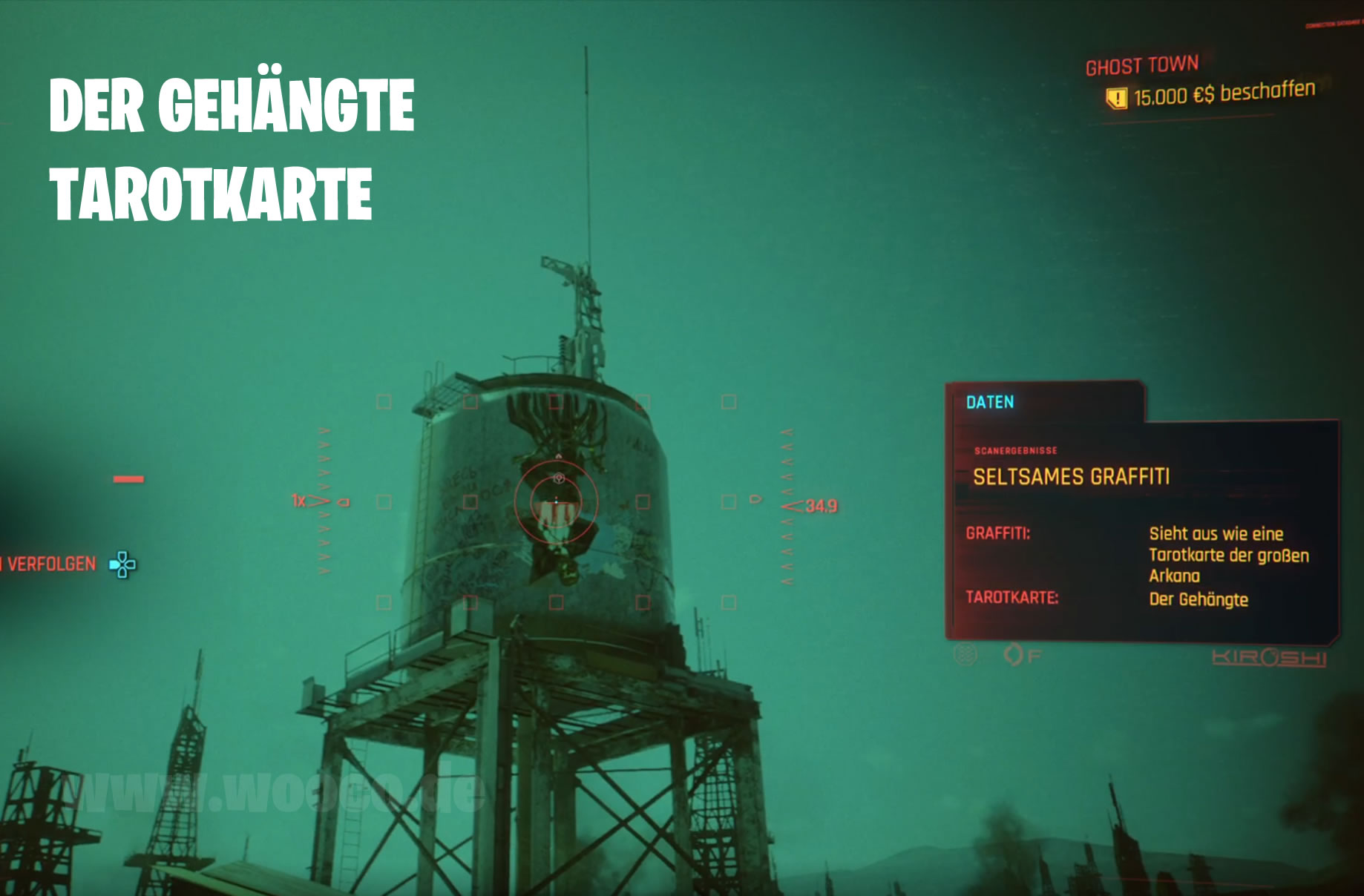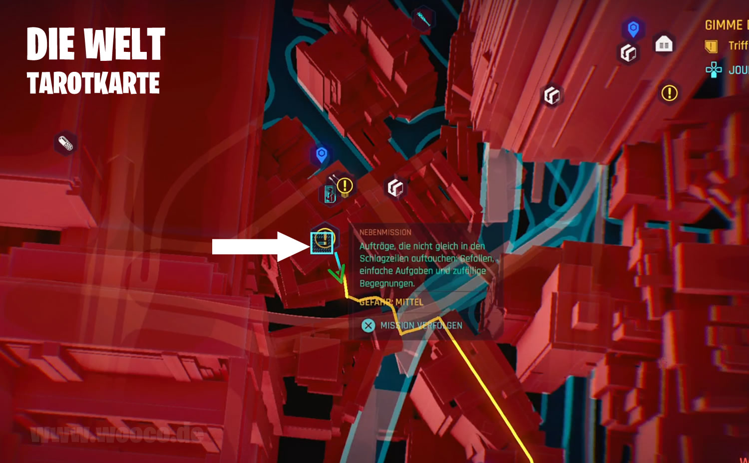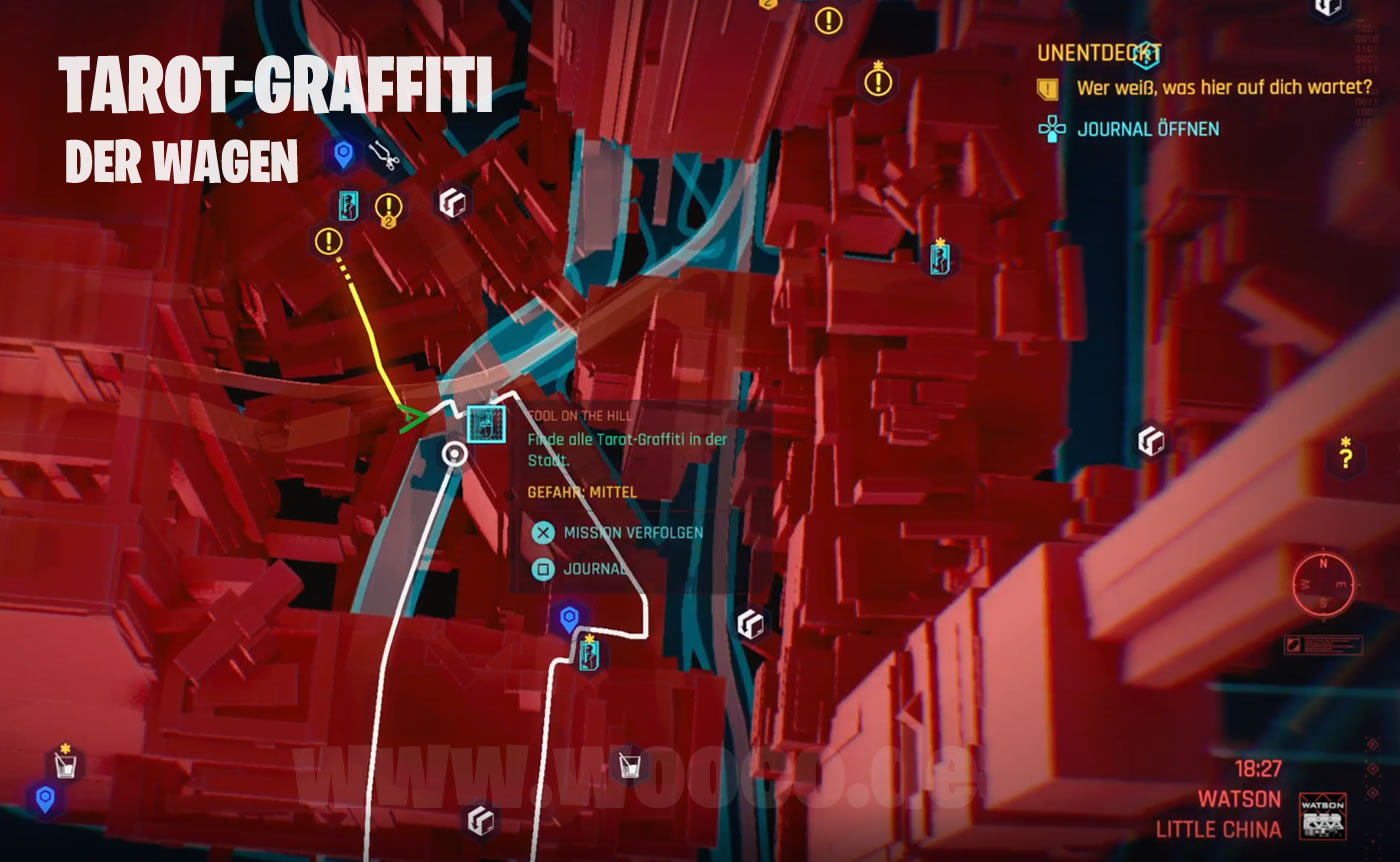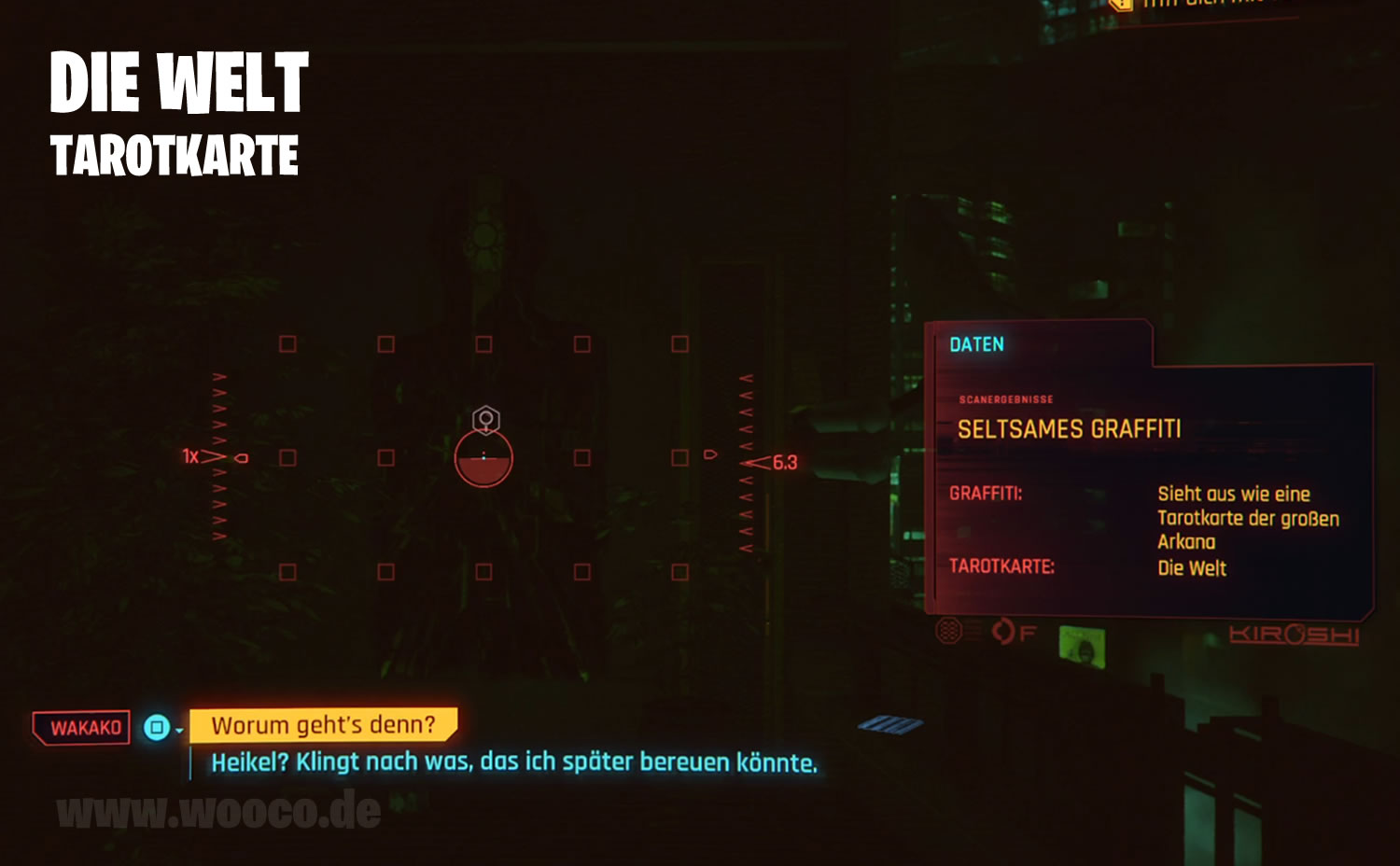 Die Mission „Der wandernde Narr“ wird freigeschaltet sobald ihr die erste Tarotkarte gefunden habt. Tarotkarten zählen auch als eine Art Sammlerstück in Cyberpunk 2077. Die Tarotkarten werden im Verlauf der Geschichte automatisch auf eurer Karte markiert. Wenn ihr an einem Graffiti-Wandbild seid drückt L1 /LB um das Graffiti zu Scannen. Beim Scannen des Tarot-Graffiti werdet ihr mit der Tarot-Karte belohnt.