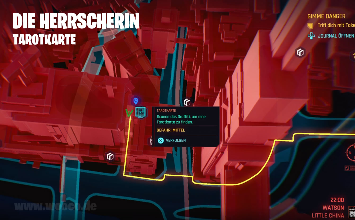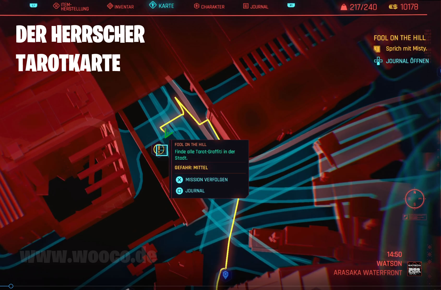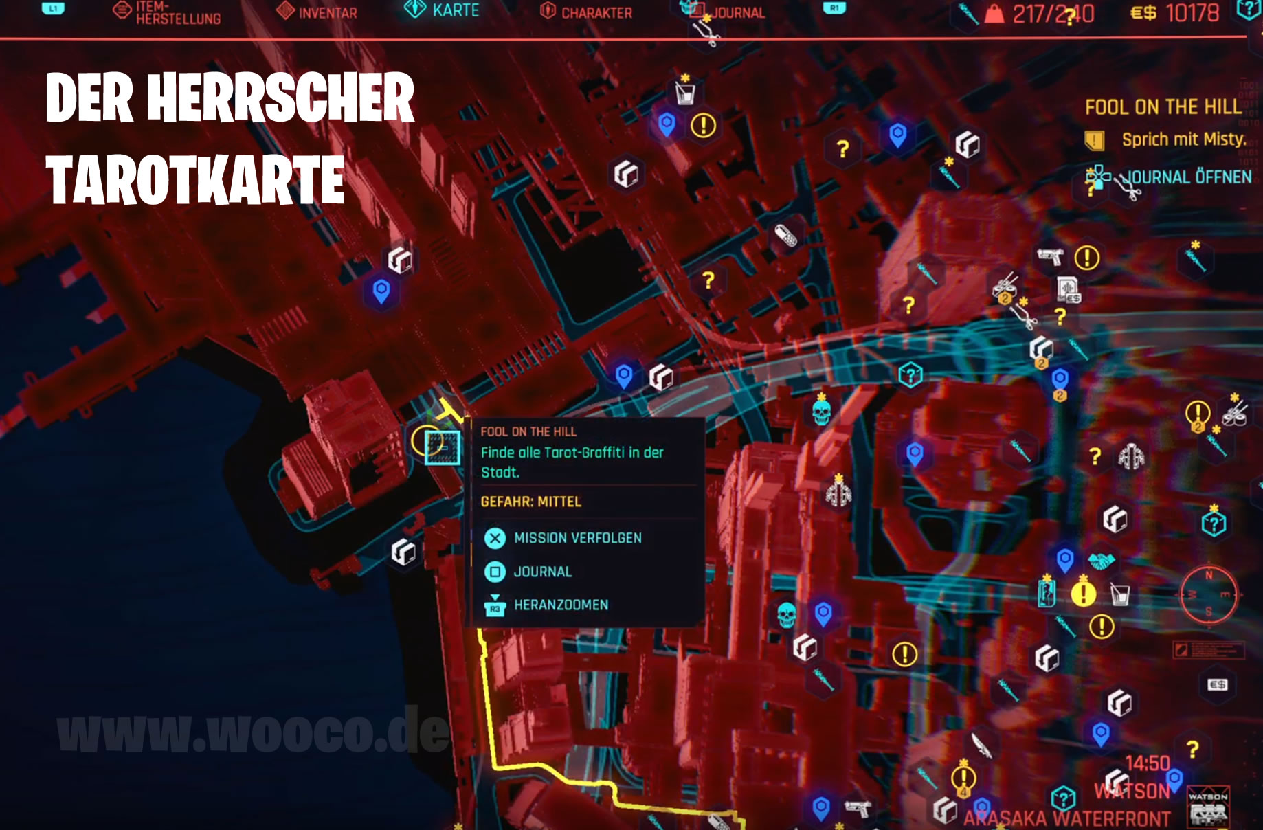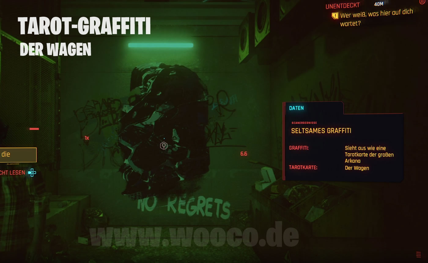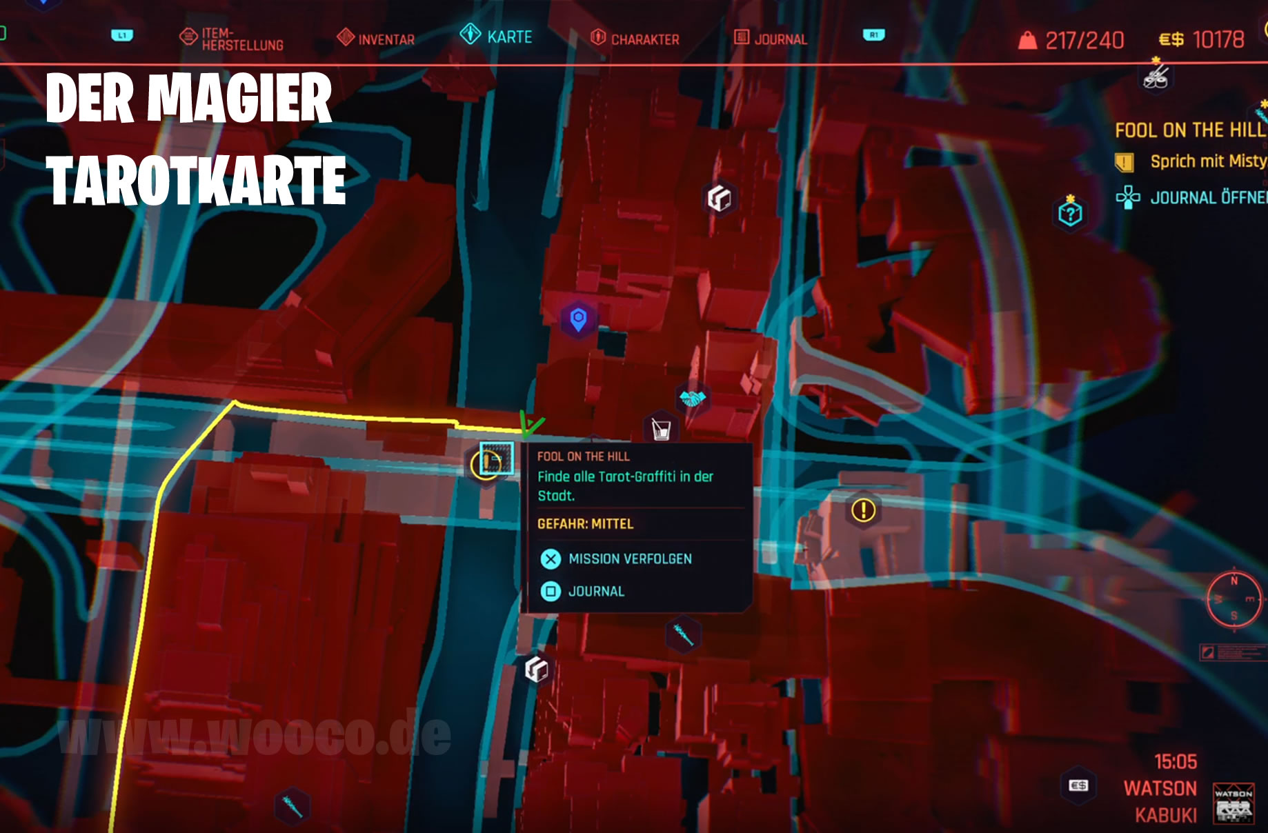 Die Mission „Der wandernde Narr“ wird freigeschaltet sobald ihr die erste Tarotkarte gefunden habt. Tarotkarten zählen auch als eine Art Sammlerstück in Cyberpunk 2077. Die Tarotkarten werden im Verlauf der Geschichte automatisch auf eurer Karte markiert. Wenn ihr an einem Graffiti-Wandbild seid drückt L1 /LB um das Graffiti zu Scannen. Beim Scannen des Tarot-Graffiti werdet ihr mit der Tarot-Karte belohnt.