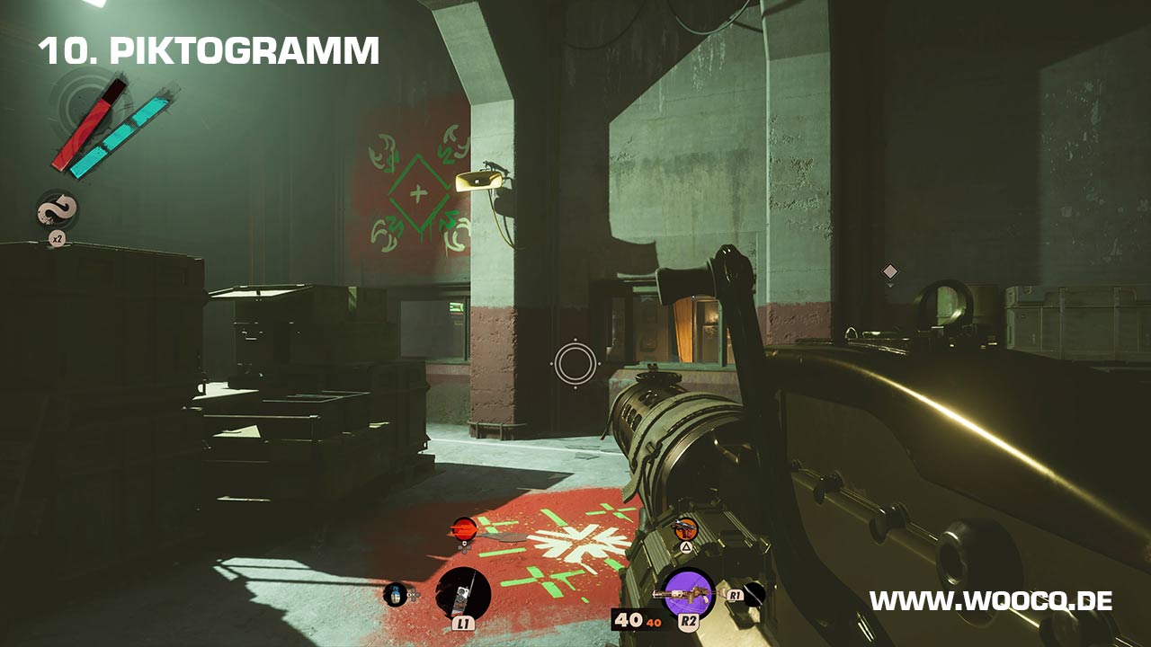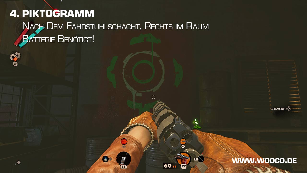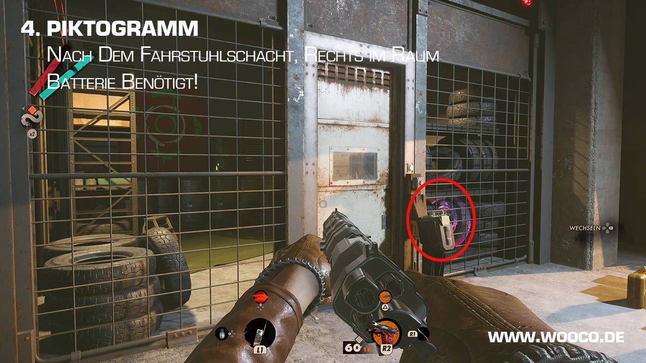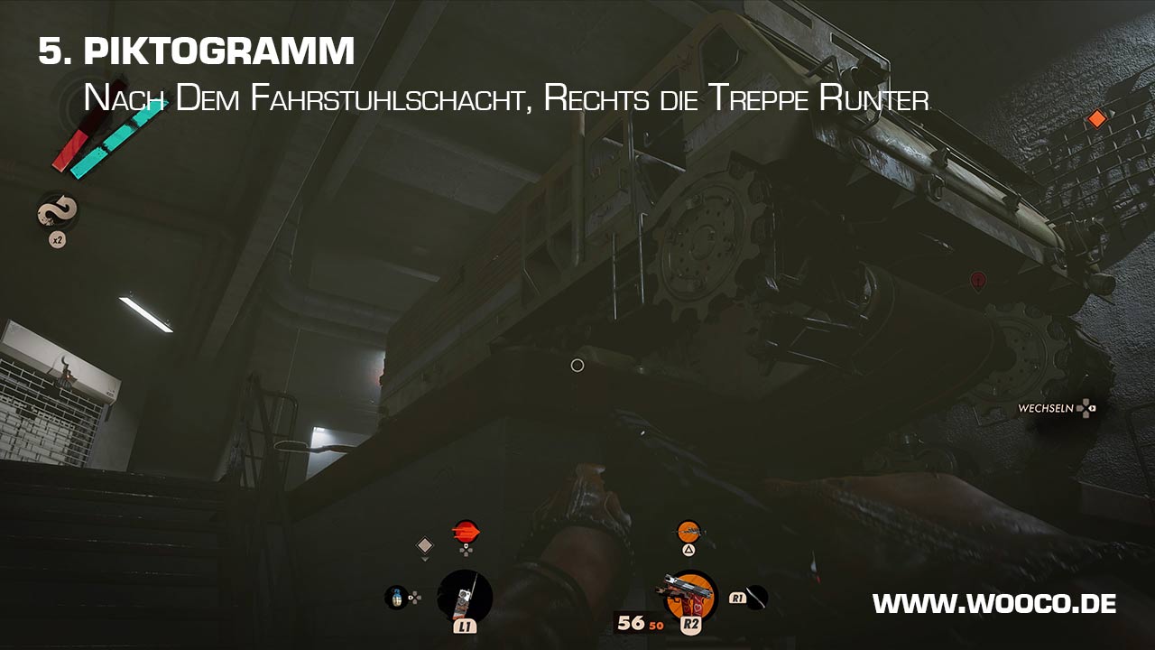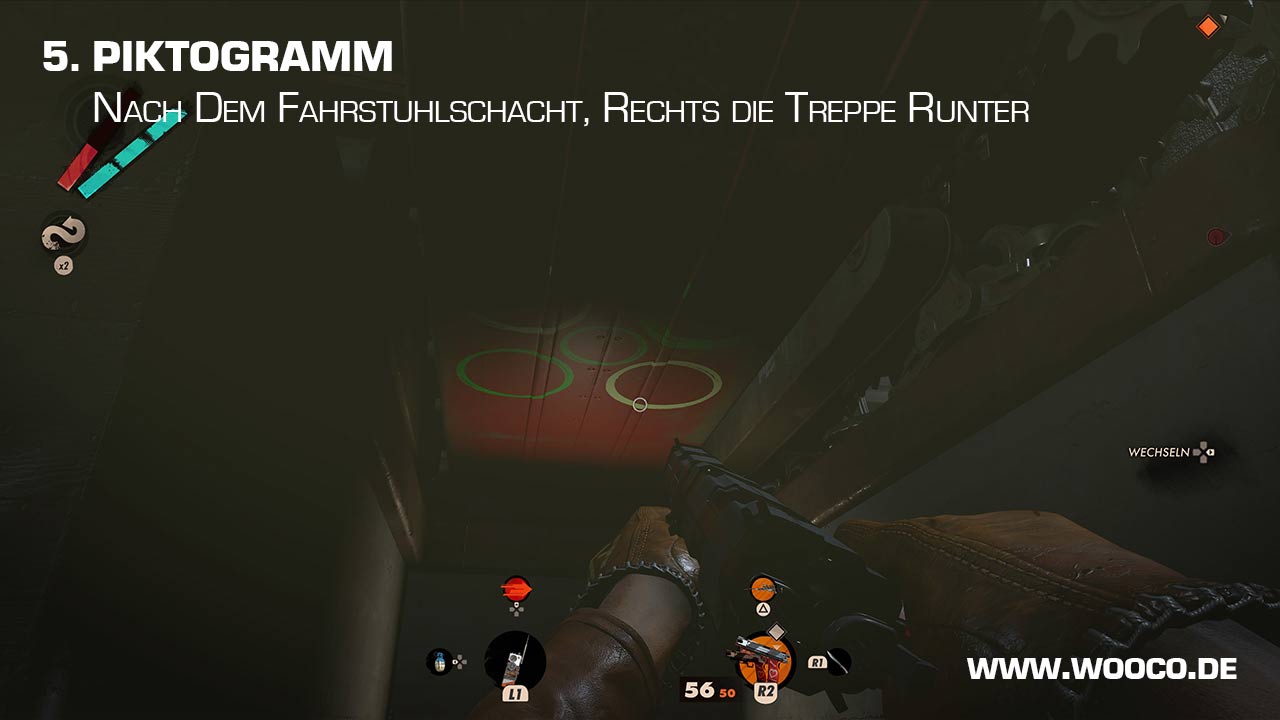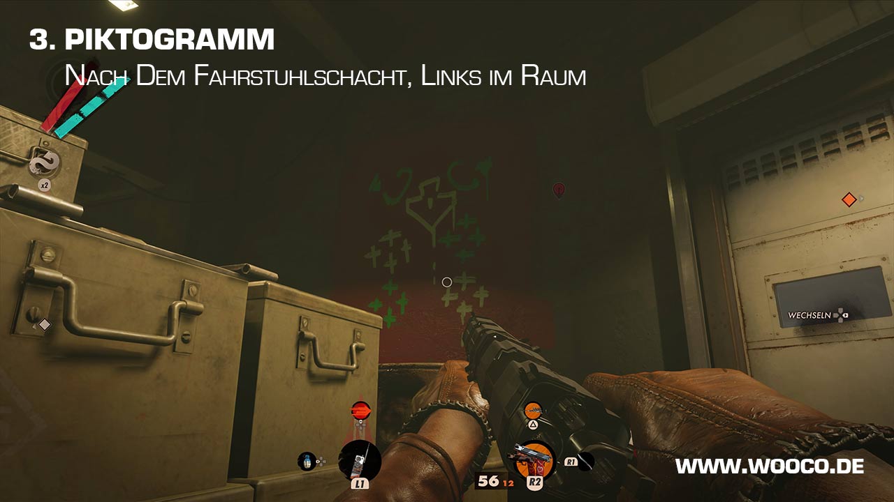Springt den Aufzug nach unten und betretet den nächsten Raum links (Tür unter der Kamera). Dort findet ihr das Piktogramm an der rechten Wand.