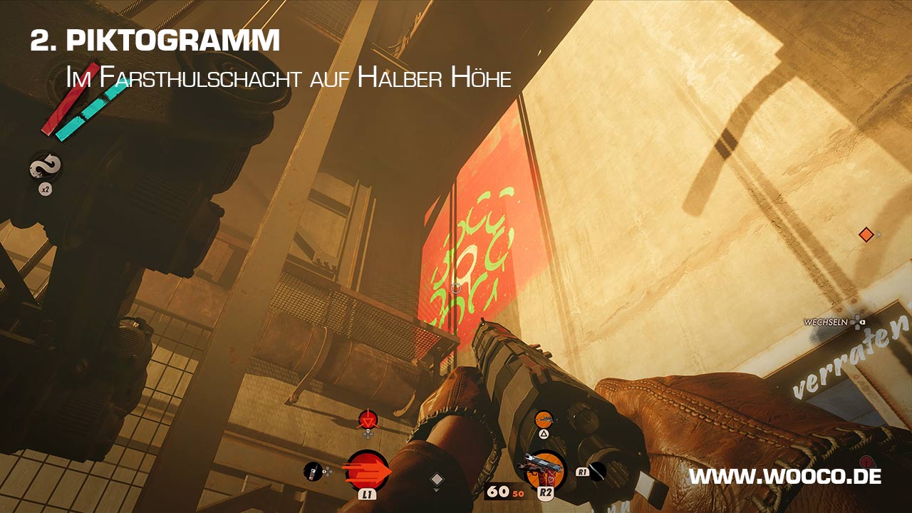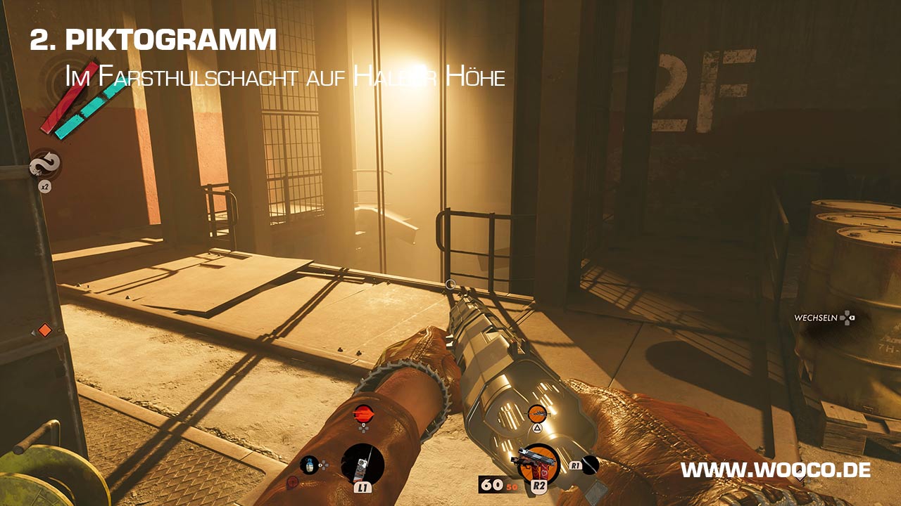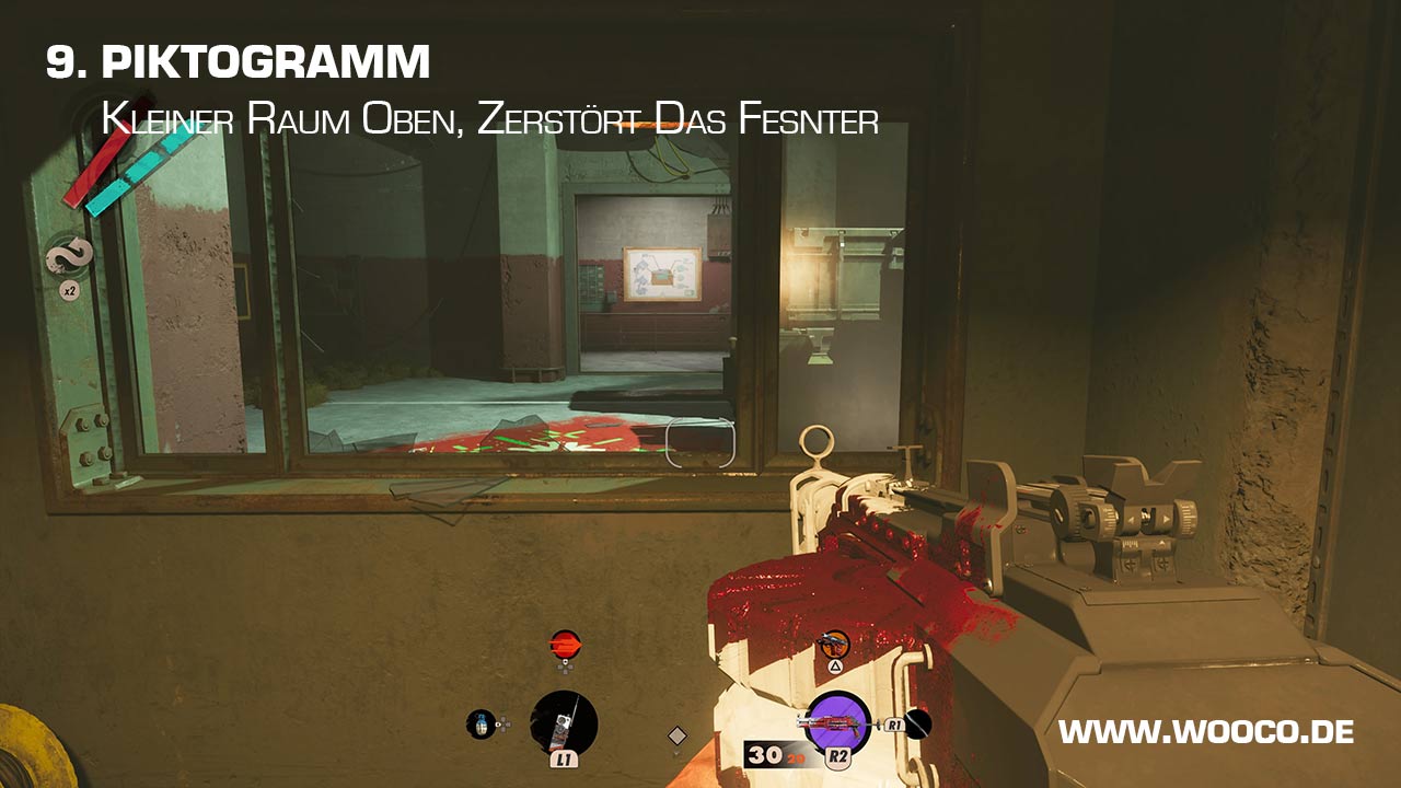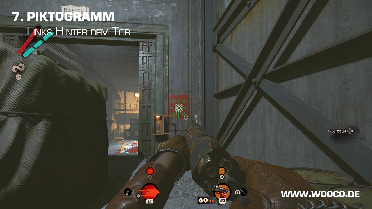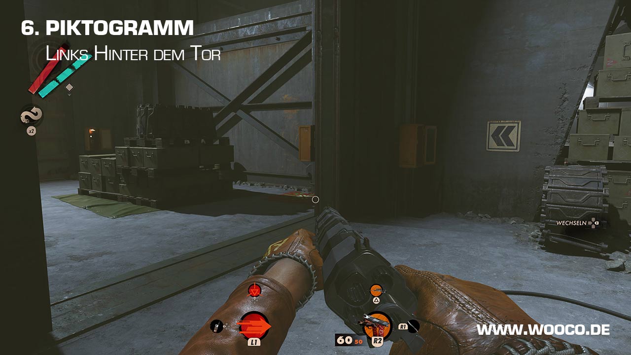 Direkt gegenüber dem vorherigen Piktogramm seht ihr oben eine Tür. Sie führt in einen Raum mit Werkbank und einer Munitionsstation. Schießt aus den kleinen Fenstern auf der rechten Seite des Raumes und klettere hindurch.