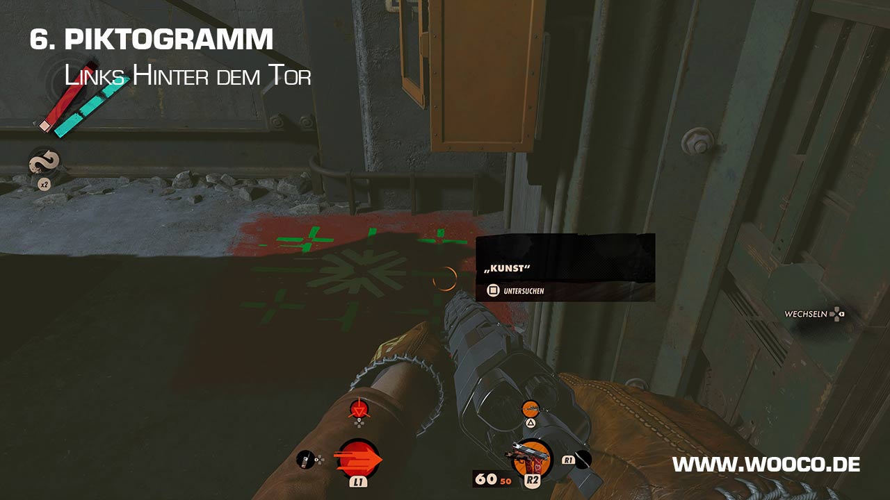 Es ist für jeden Spieler zufällig, welche Piktogramme die richtigen sind, daher enthält diese Anleitung alle Möglichen Standorte. Die Piktogramme befinden sich immer an derselben Stelle. Nur welche für euch Relevant sind (und in welcher Reihenfolge) wird von Spieler zu Spieler unterschiedlich sein. Geht einfach alle einzeln durch, um alle benötigten Piktogramme (Kunst) zu finden.