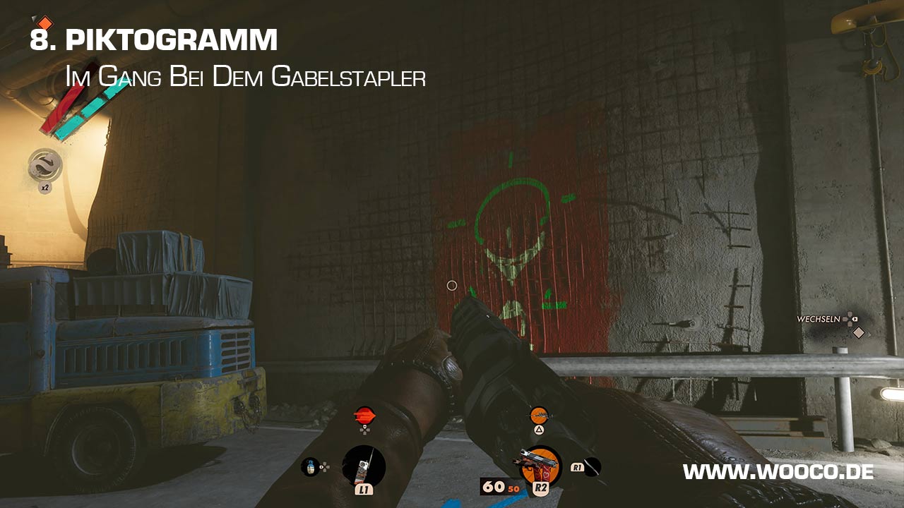 Geht nun geradeaus durch den langen Tunnel, wo ein paar Graffiti auf den Boden sind. Auf der rechten Seite befindet sich ein weiteres Piktogramm an der Wand. Es ist kurz vor einem Gabelstapler.