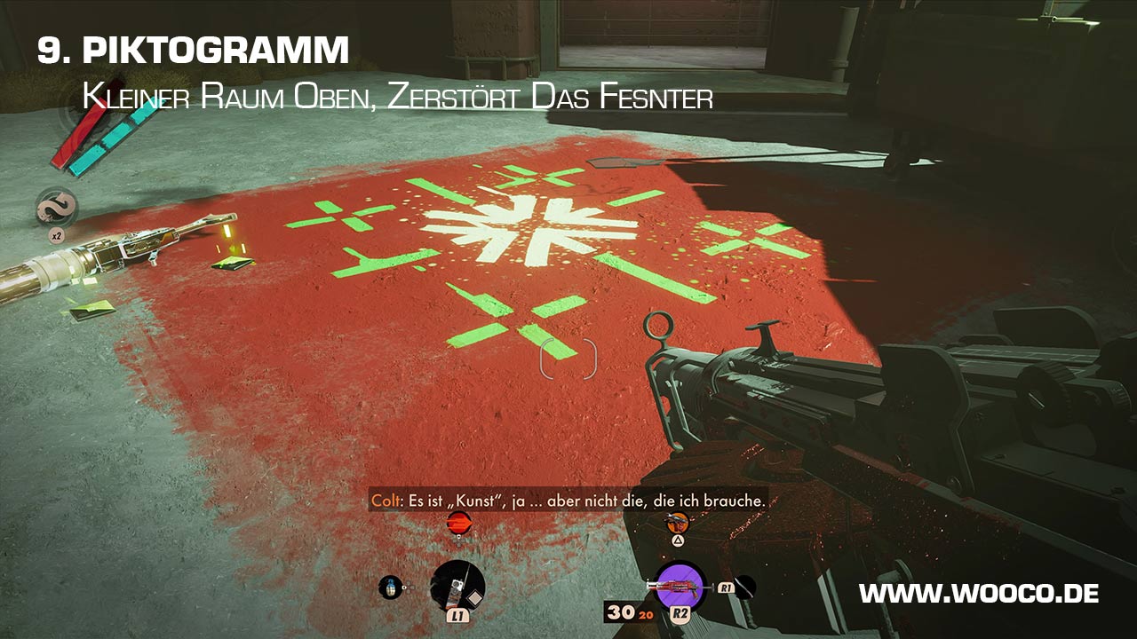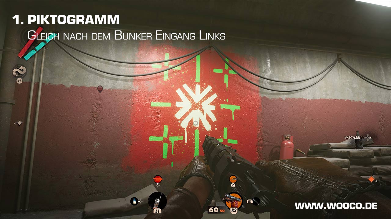 Verlasst diesen Bereich und haltet euch rechts. Ihr seht einen großen gepanzerten Lastwagen. Geht die Treppe daneben hinunter und schaut unter den Lastwagen. Auf der Unterseite des Lastwagens ist das Piktogramm.