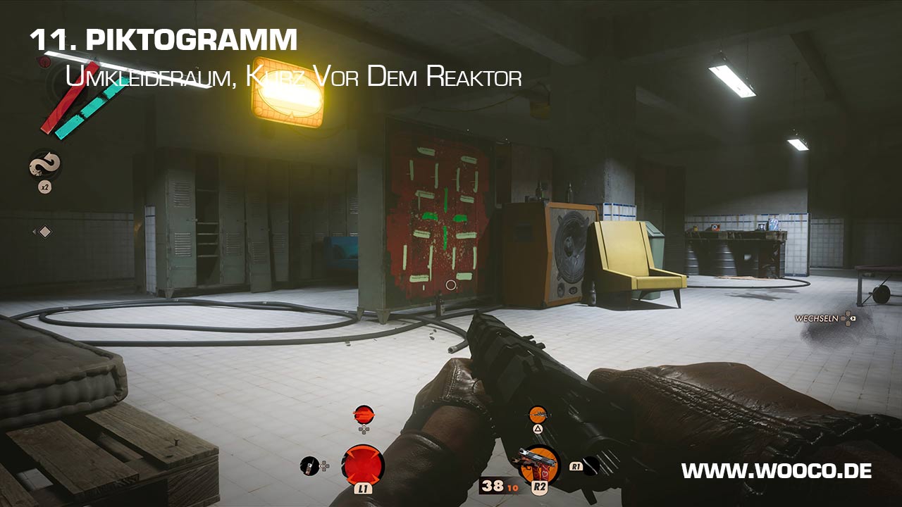 Direkt gegenüber dem vorherigen Piktogramm findet ihr einen Gang, der zur Umkleide führt. Auf dem letzten Spind rechts findet ihr ein weiteres Piktogramm.
