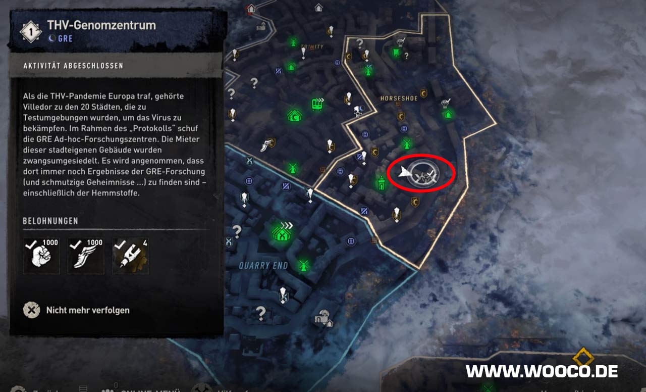 Begebt euch zu der GRE-Quarantänestation: GRE-Impfstofflabor. Ihr müsst über das Dach in das Gebäude eindringen, wo sich das Quarantänesymbol auf der Karte befindet. Wieder müsst ihr 4 Hemmstoffe finden, schaut bei der ersten Truhen befindet auf dem Schreibtisch.