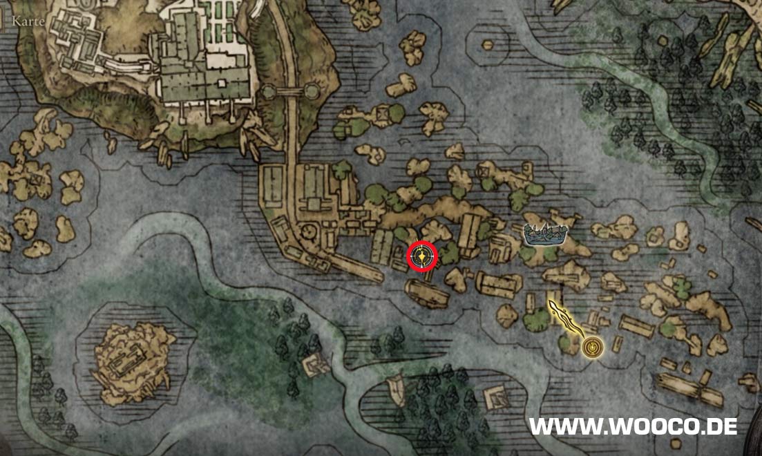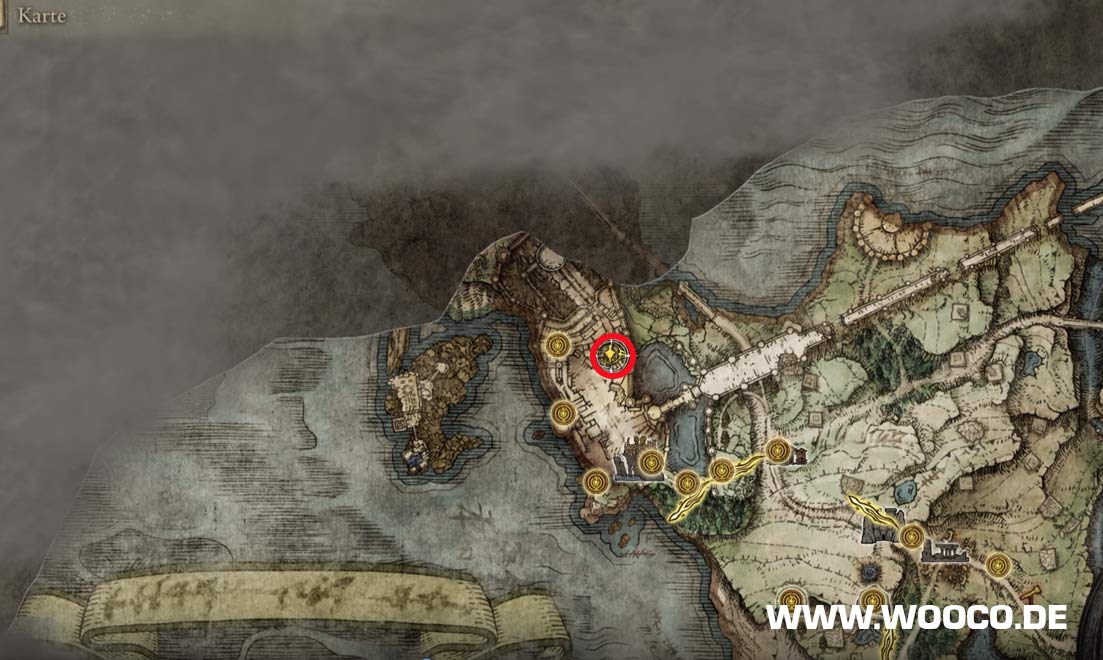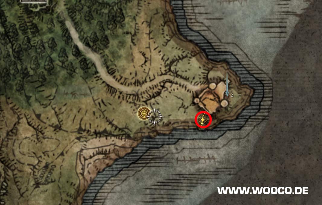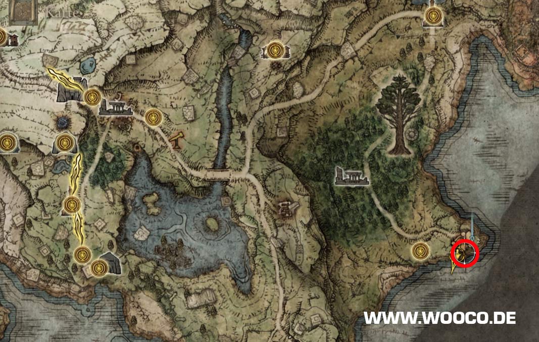 Nordwestlich vom letzten Ort . Reitet vom Aussichtshügel des Erdenbaums etwas nach Süden, dann nach Westen und dann in den Norden, ihr müsst den Hügel umreiten.
