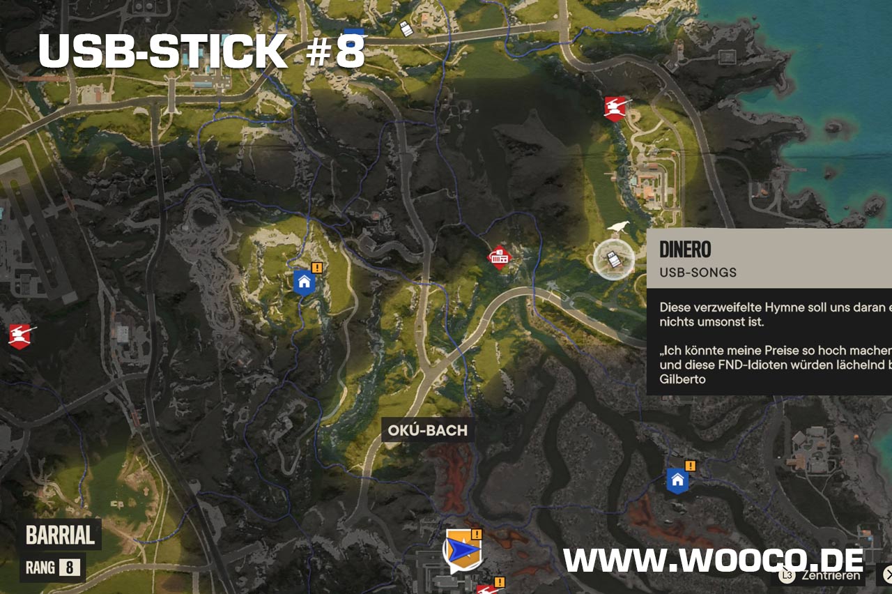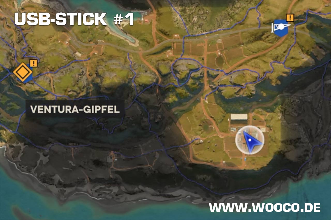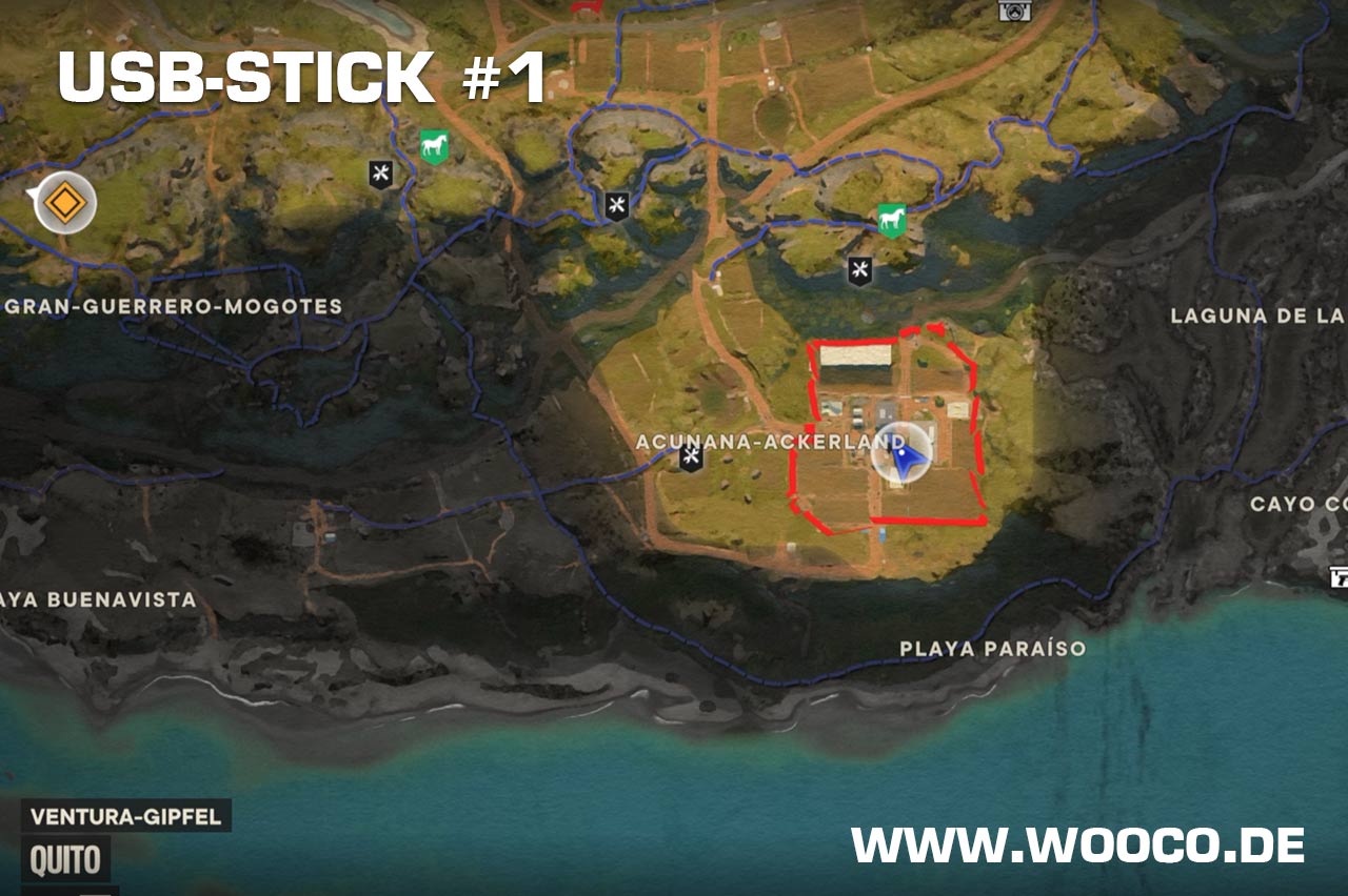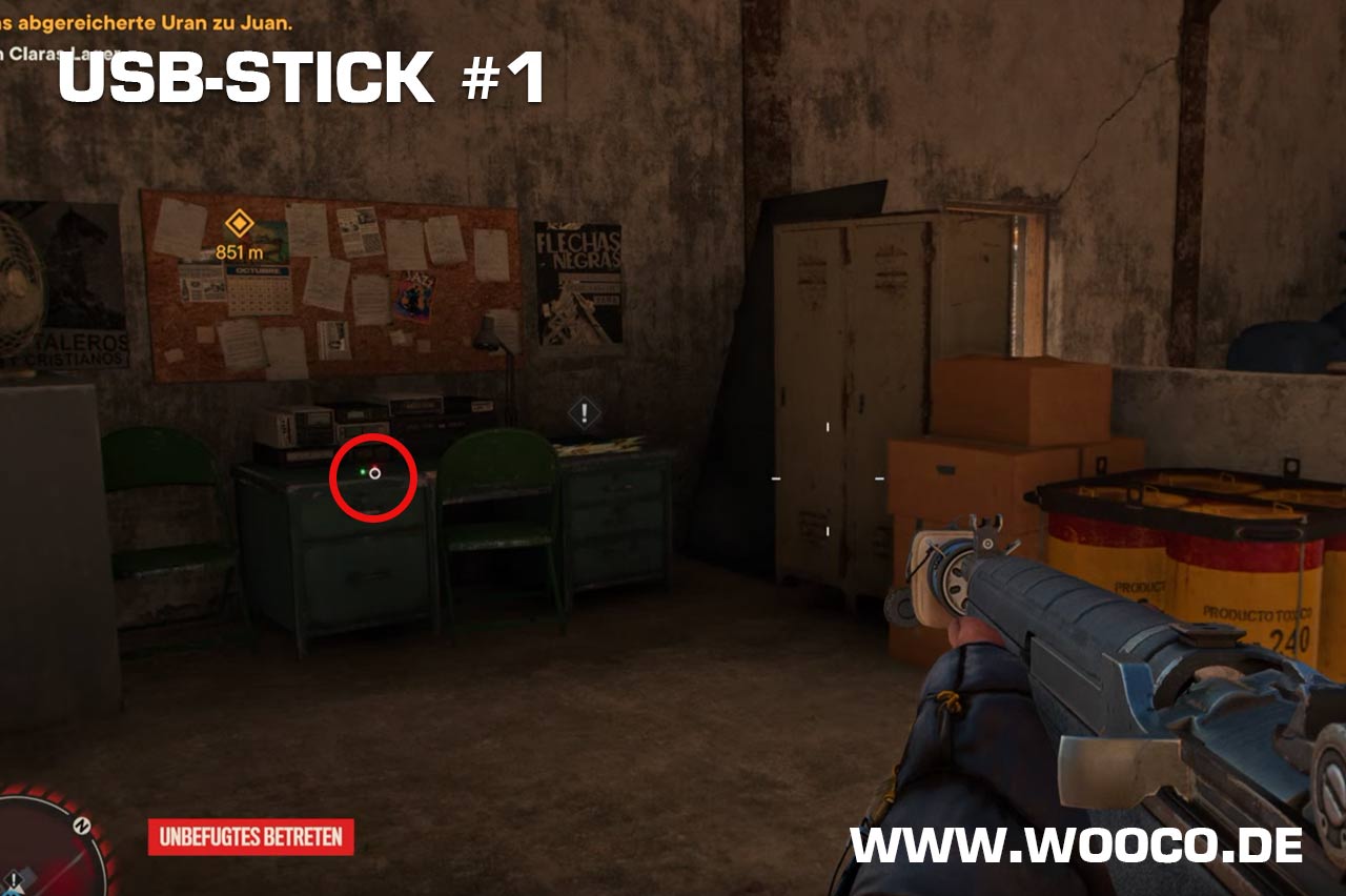 Begebt euch in den Südosten von Santuario, dort findet ihr den Ort Plantage Viviro Nueve. Durchsucht das Gebäude um den ersten USB Stick zu erhalten.