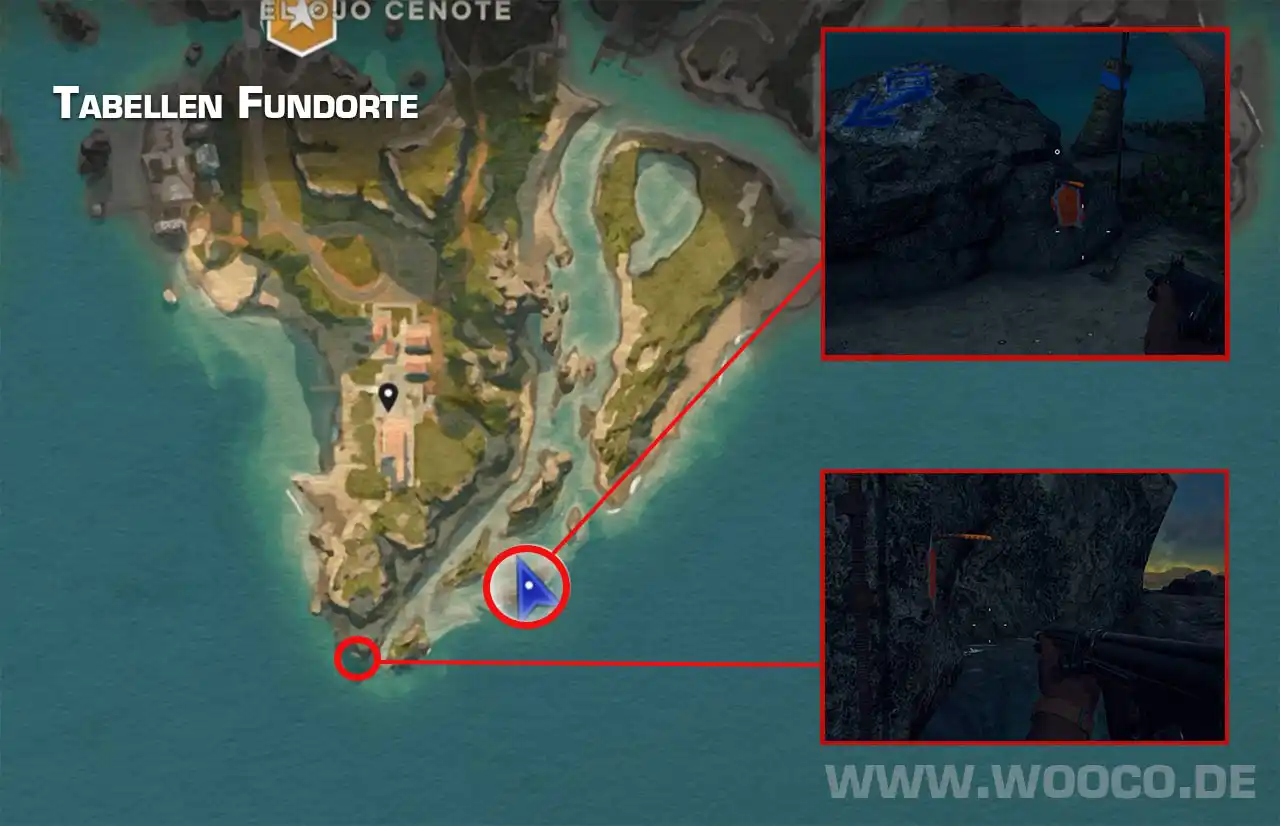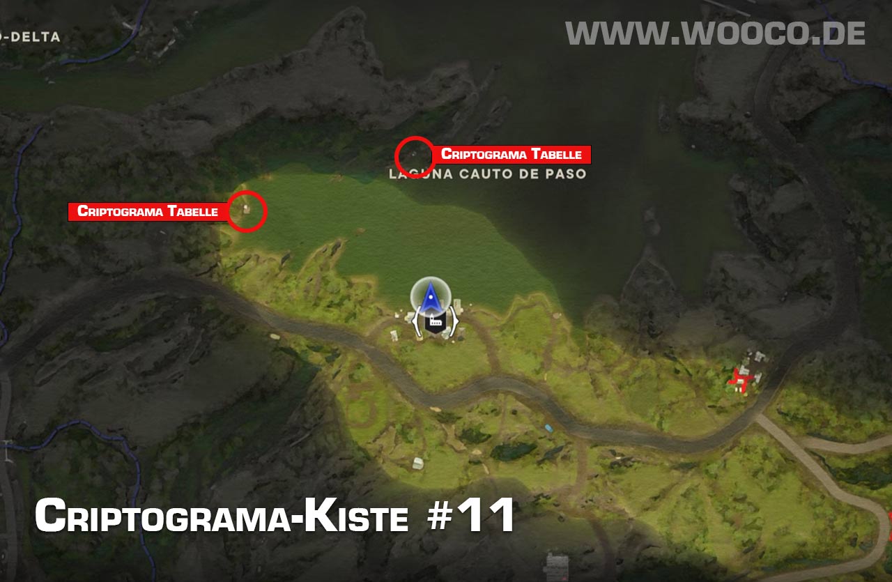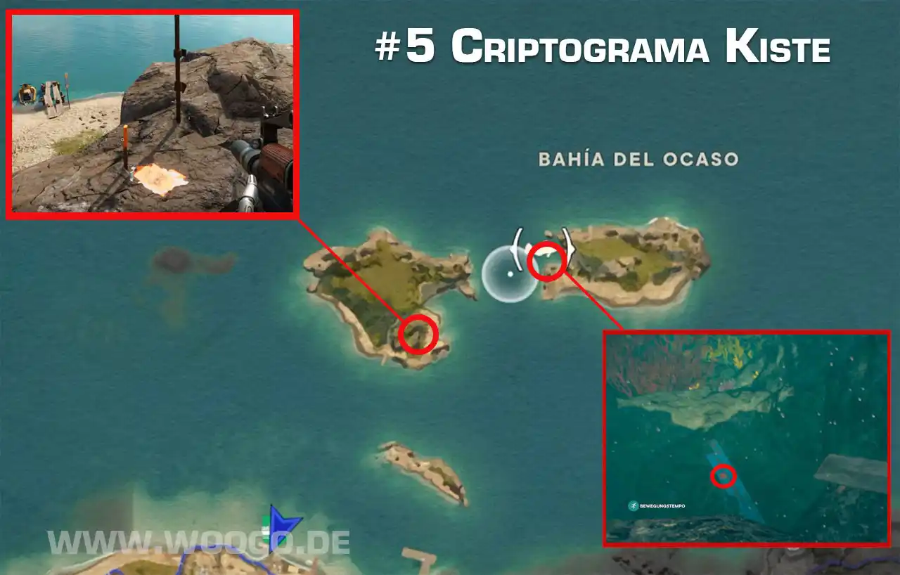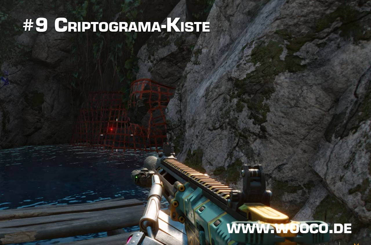 Die erste Criptograma-Tabelle befindet sich am Wasser, unterhalb des Stegs. Die zweite befindet sich in einer Höhle. Der Eingang befindet sich unterhalb der Kiste, schießt vom Ufer aus auf die orangefarbenen Netze, um den Eingang aufzubrechen.