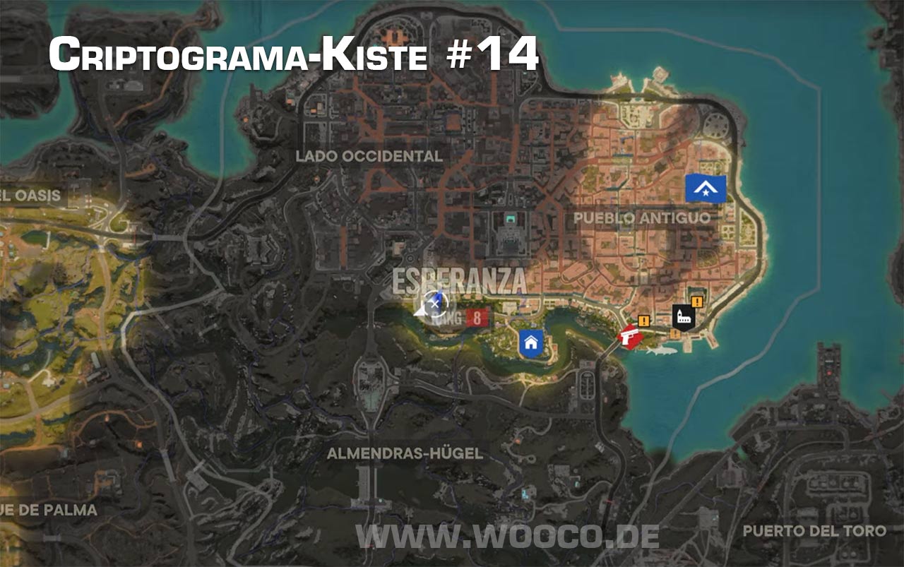 Die Truhe findet ihr in El Este, Casa Marroquin. Es sind nur wenige Meter Südlich von Kiste 11. Die Kiste ist auf dem Dach der Hütte.