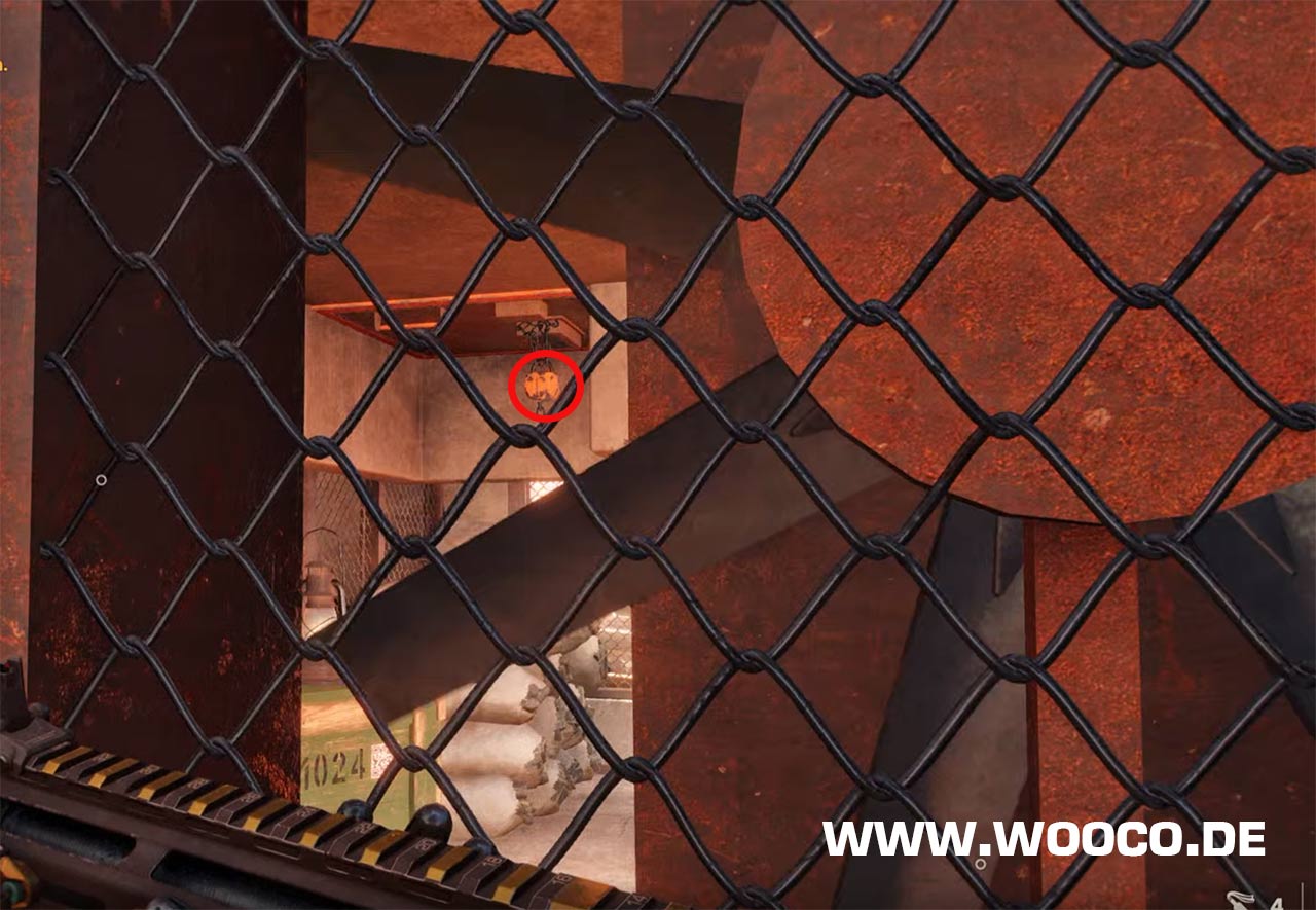 - Dreht euch einmal um und Lauft in die Öffnung des Gebäudes, bis ans Ende. Dort seht ihr ein kleines Fenster, dahinter ist ein Ventilator. Schaut durch das Fenster, nach links oben, schießt auf die Vorrichtung an der Decke.