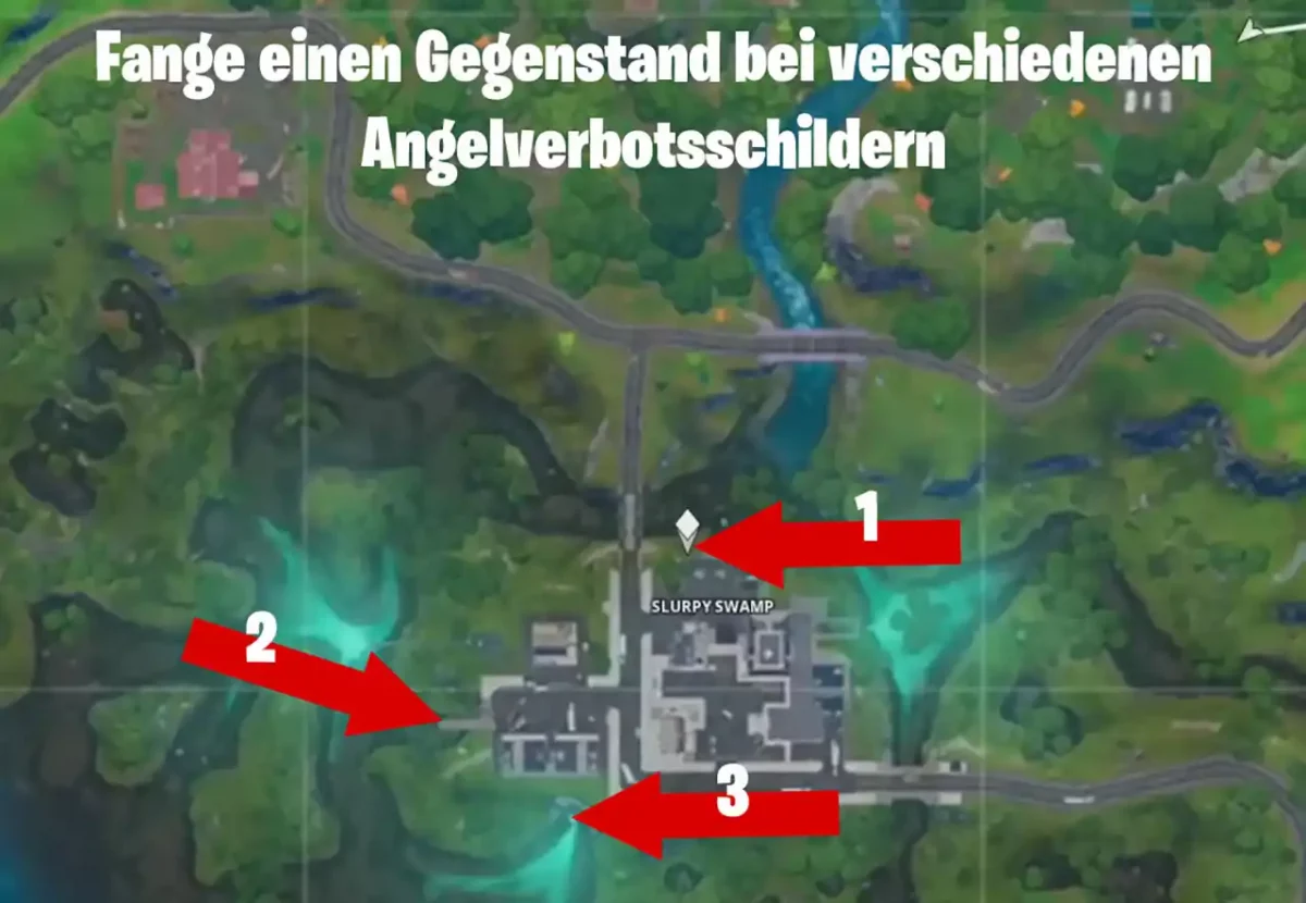Die Angelverbotsschilder sind über die ganze Karte verteilt, besonders häufig aber rund um Slurpy Swamp. In dieser Gegend findest du gleich mehrere Stellen mit den typischen Schildern, die ein durchgestrichenes Fischsymbol zeigen. Wenn du clever bist, kannst du die Challenge sogar innerhalb einer einzigen Runde abschließen – ganz ohne lange Sucherei.