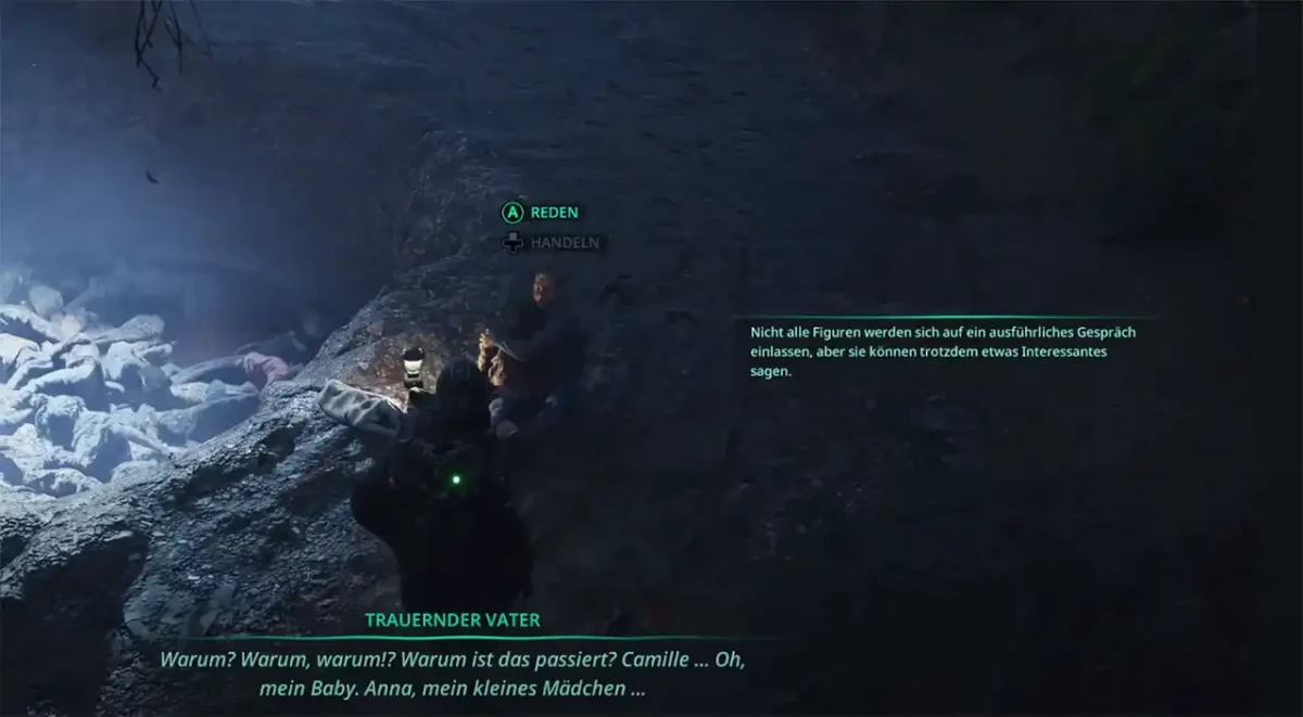 Dein erster Schritt führt dich ins Sumpfgebiet von Acasa. Direkt vor dem Massengrab sitzt der Trauernder Vater, zusammengekauert und voller Verzweiflung. Sprichst du ihn an, hörst du, wie er immer wieder klagt: „Warum, warum, warum? Camille, oh mein Baby, Anna, mein kleines Mädchen …“ – Worte, die sofort klar machen, wie sehr er gebrochen ist.